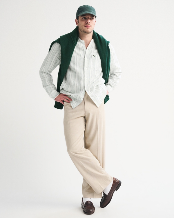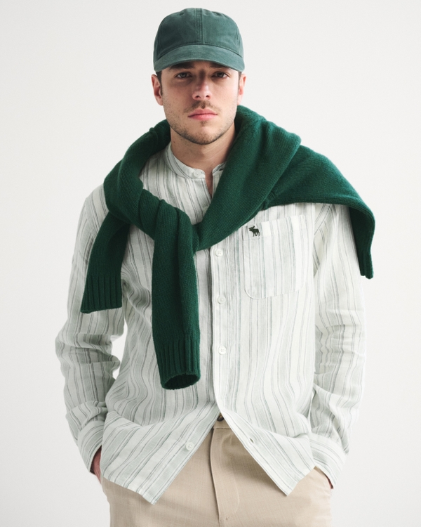 ソフトな100%リネン素材とリラックスフィットのシルエットが特徴的な長袖ボタンアップシャツ。バンドカラー、左胸ポケットにアイコン刺繍、カーブドヘム。 輸入品