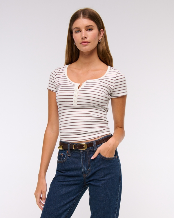 softAFリブ素材を使用したスリムフィットの半袖ヘンリートップ。クロップド丈、スナップボタン留めのネックライン、左胸にアイコン刺繍、総リブ仕上げ。 輸入品