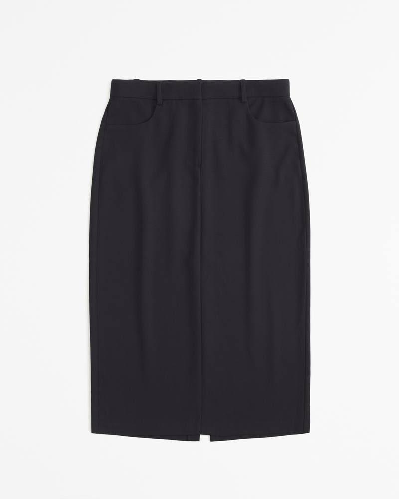 軽量なスーツ用素材を使用した、ハイライズのミディスカート。テーラードフィット、ベルトループ、フロントポケット付き、フロントスリット。 輸入品