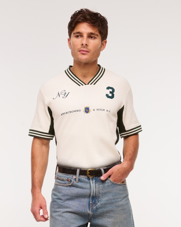 舒適足球衣風格的短袖毛衣,採用柔軟毛衣針織面料製成,寬鬆版型剪裁;略為高挑,胸前飾有 Logo 刺繡細節,V 領設計、衣領和袖子上帶有飾邊細節、搭配束口下擺和袖口。 進口貨品