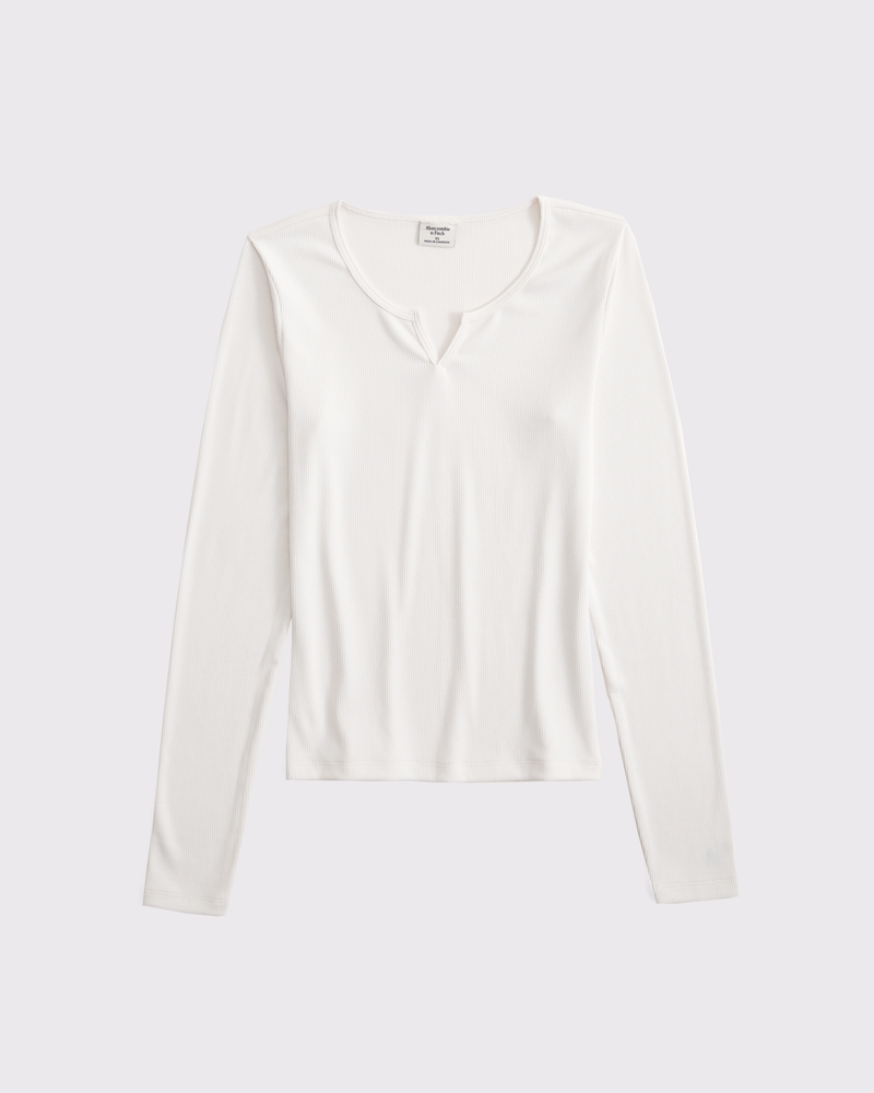 Long-Sleeve Rib Notch-Neck Top