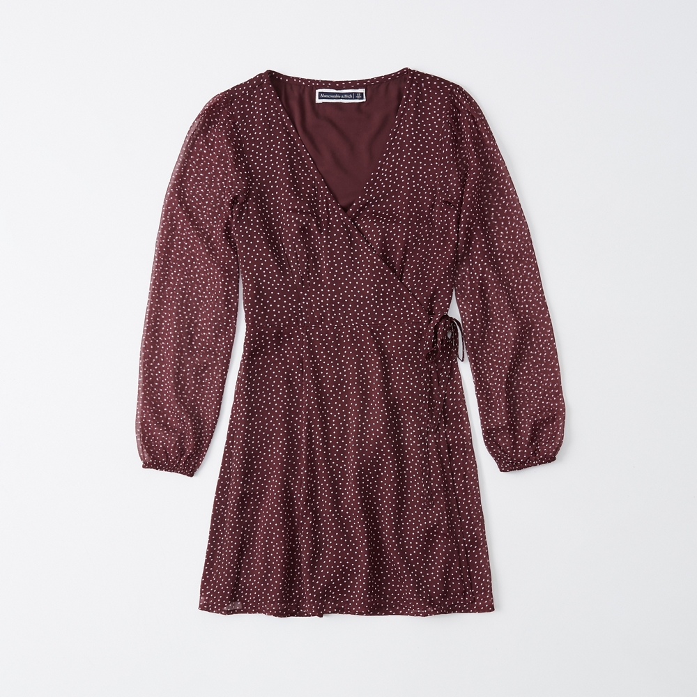 Long-sleeve chiffon dress in wrap silhouette with elastic cuffs, defined waist and flattering pleats on front. Imported
