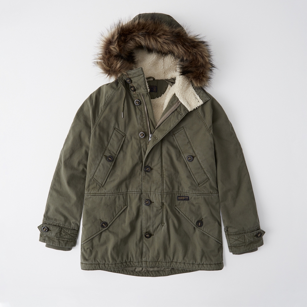 Comfortable parka coat in a cotton fabric with cozy Sherpa lining. Button and zipper closure, bungee cord at waist, patch logo, ribbed cuffs, faux-fur-lined hood, inside pocket and fleece-lined welt pockets. Imported