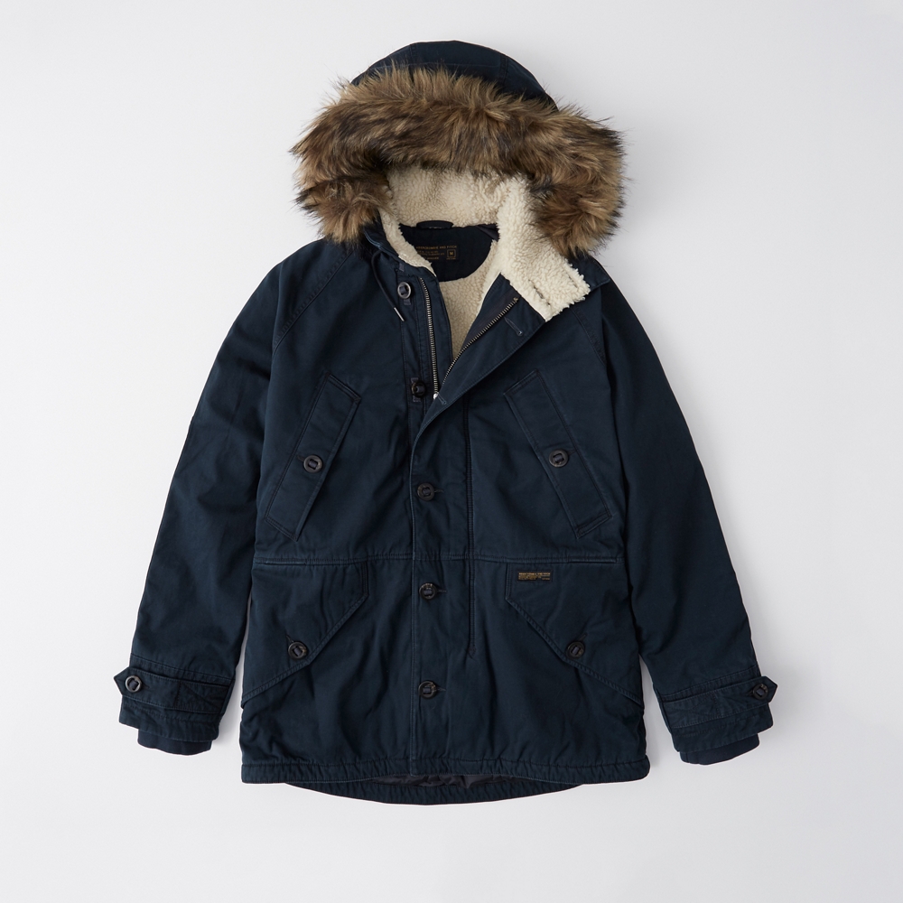 Comfortable parka coat in a cotton fabric with cozy Sherpa lining. Button and zipper closure, bungee cord at waist, patch logo, ribbed cuffs, faux-fur-lined hood, inside pocket and fleece-lined welt pockets. Imported