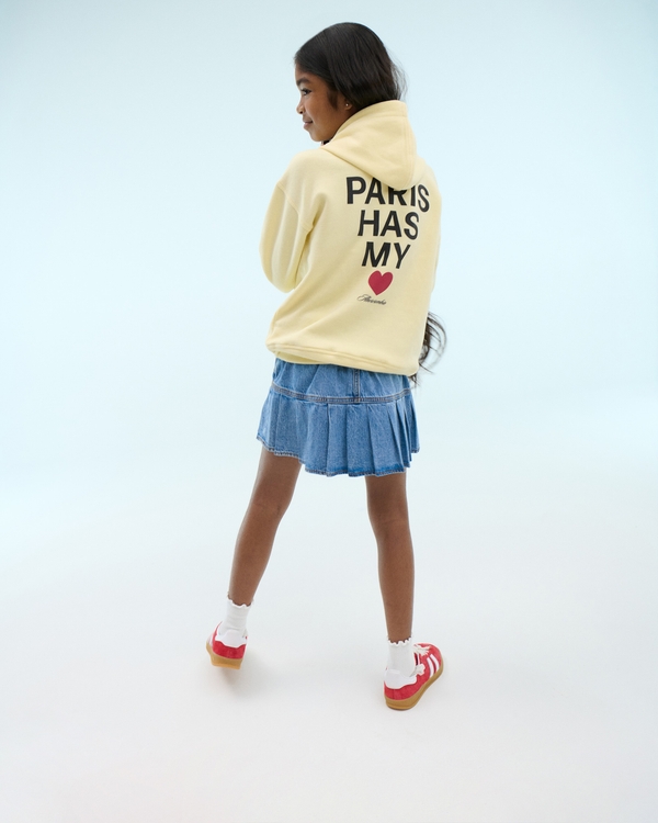 Super comfy popover hoodie in our core fleece fabric and legging-friendly length, with graphic logo detail at left chest and back, front pouch pocket, banded hem and thumbholes at cuffs. Imported.