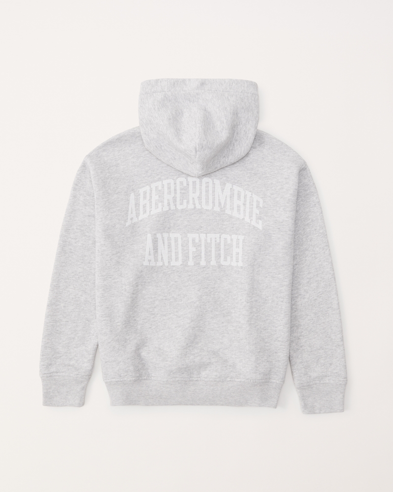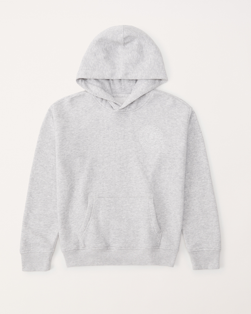 Comfy popover hoodie in a soft fleece fabric, with print graphic logo details at left chest and back, front pouch pocket and banded hem and cuffs. Imported.