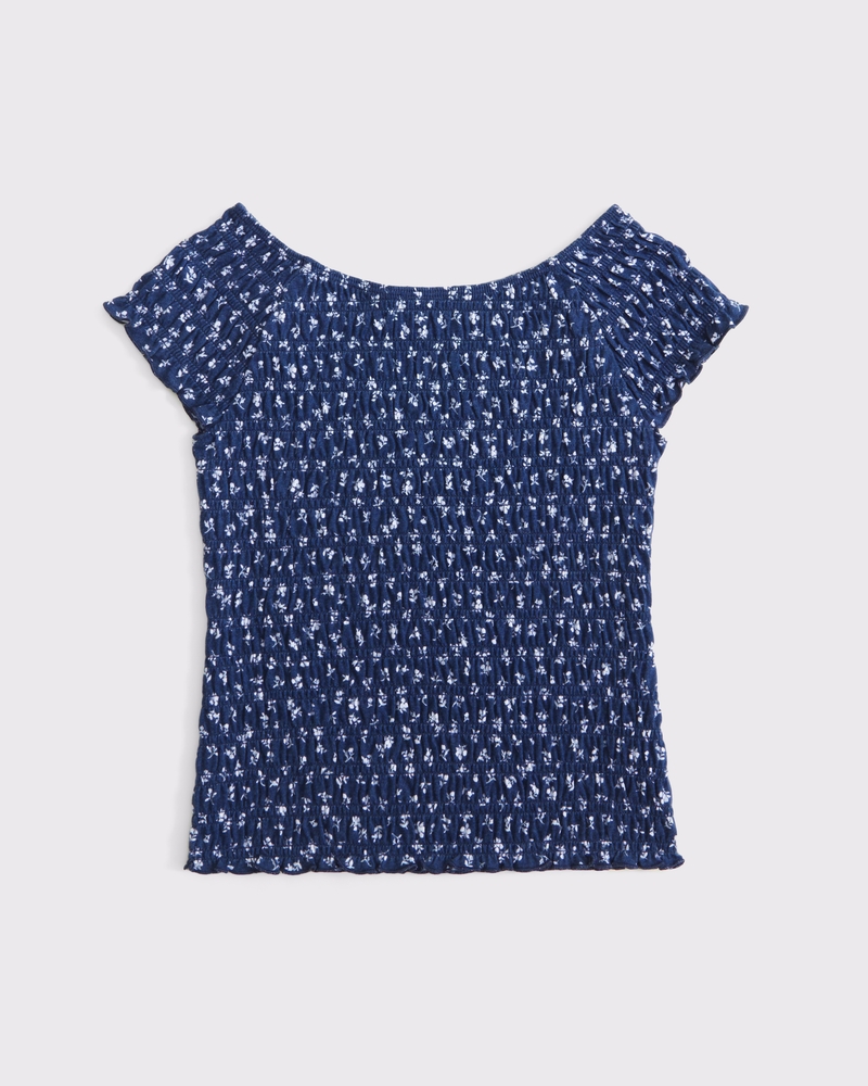Comfortable short-sleeve tee in our soft jersey fabric, with all-over smocking and off-the-shoulder detail. Imported.