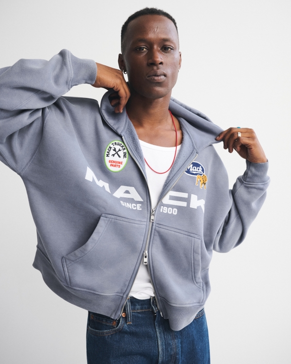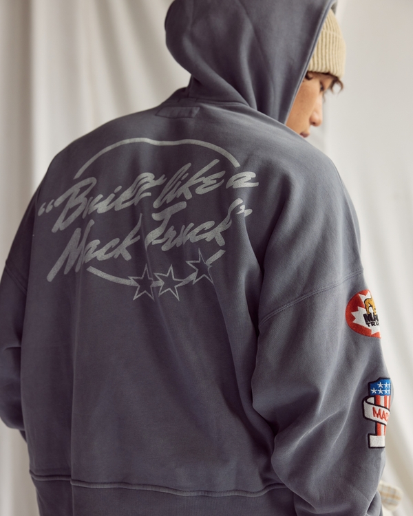 Comfortable full-zip hoodie in our softAF fabric and oversized, drop-shoulder fit, featuring a cropped length, Mack Truck-inspired graphic details at chest and sleeve, zip-up front, side pockets and banded hem and cuffs. Imported.