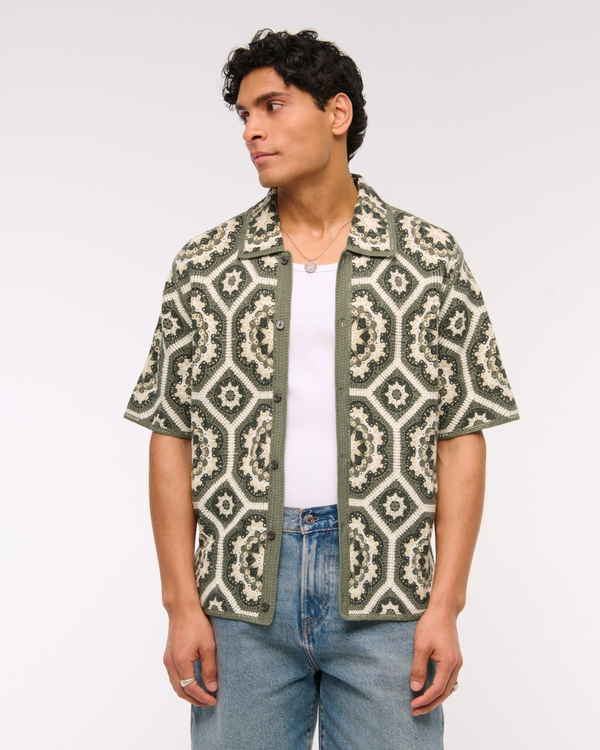 Crochet-Style Floral Button-Through Sweater Polo