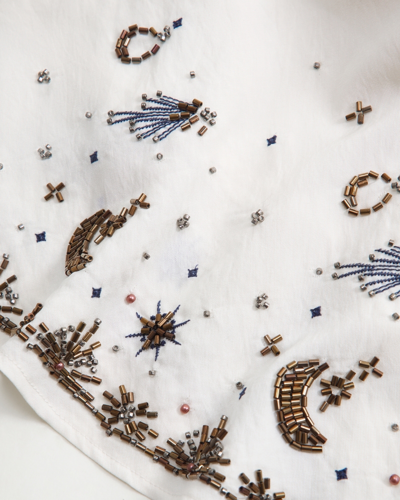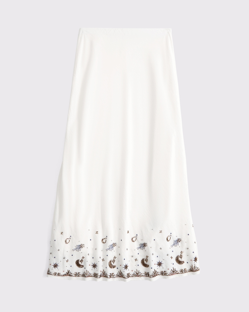 High rise maxi skirt in our soft woven fabric. Features a full-length skirt, embroidered beaded details along the hem and a pull-on style elasticated waistband. Imported.