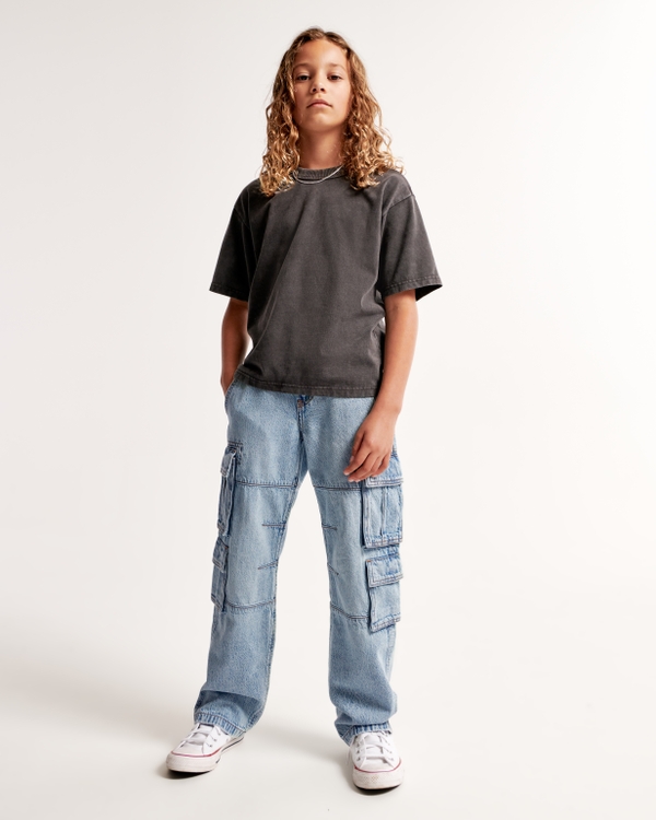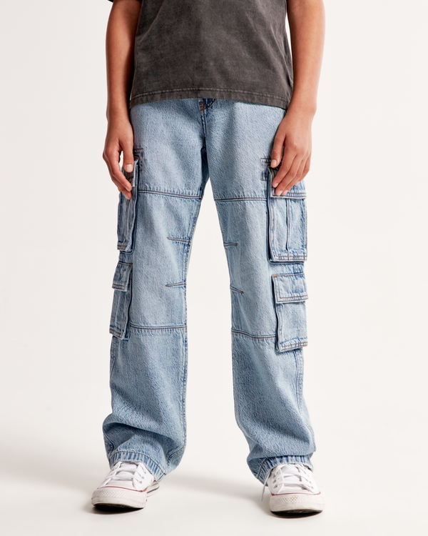 Easy-fitting jeans in a loose fit and our ultimate stretch fabric, styled with 5-pocket construction and waistband adjusters in all sizes. Light wash and cargo-style pockets. Sizes 5/6 and 7/8 have snap-front closures and sizes 9/10 and up have button-front closure. Imported.