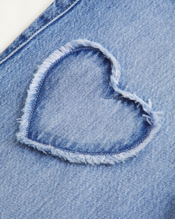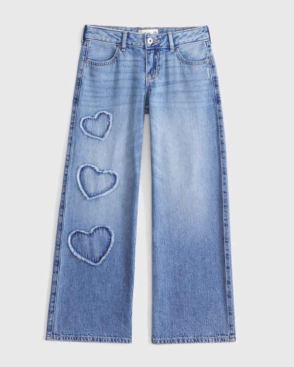 Our new lightweight low rise baggy fit jeans, that gives a relaxed fit through the leg with straight leg opening, in a light wash, with on-trend heart graphic details down the leg, functional pockets and waistband adjusters in all sizes. Imported.