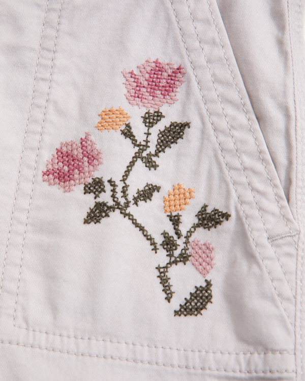 Our new high rise ultra wide leg pants in a soft twill fabric, with embroidered floral print pattern, zipper closure and cargo-style pockets. Imported.