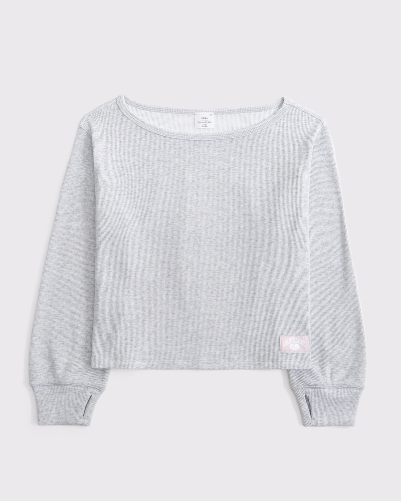Sudadera cómoda en nuestro acogedor tejido CUADROS EN RELIEVE y de corte corto, que llega por encima de las caderas. Presenta un escote con hombros descubiertos, una pequeña etiqueta con el logo de YPB en el dobladillo, textura de cuadros en relieve por toda la prenda y orificios para los pulgares en los puños. Artículo importado.