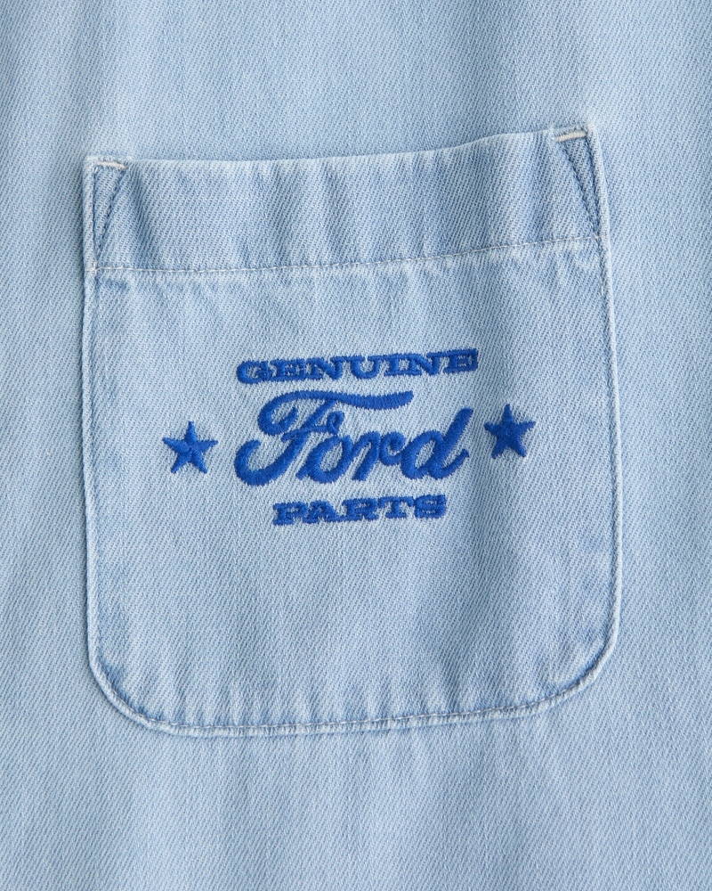 Cómoda camisa abotonada de manga corta confeccionada en nuestro tejido de denim ligero y silueta de corte holgado. Diseño con cuello clásico, bolsillo en la parte izquierda del pecho, detalles de estampa de retazos inspirados en Ford en toda la prenda y dobladillo recto. Artículo importado.