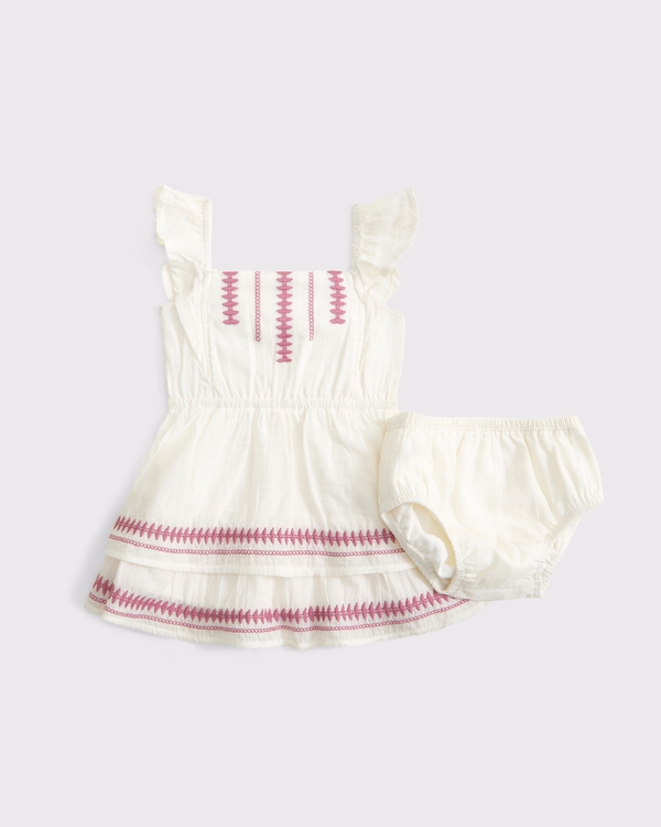 Our short-sleeve dress in a soft woven fabric. Features embroidered details along the bodice, flutter sleeves and a tiered skirt. Includes matching baby bloomers, too. Imported.
