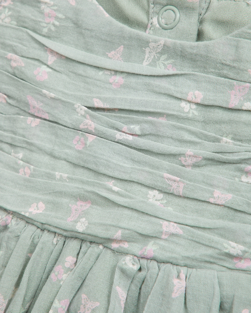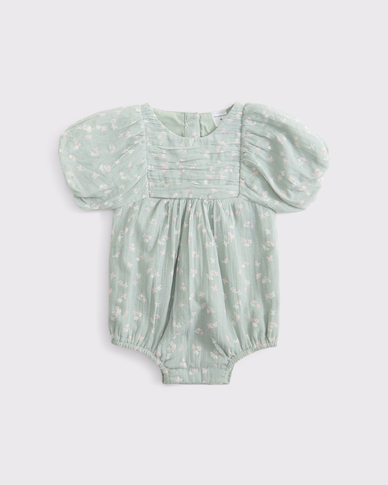 Our short-sleeve bubble romper in a super soft woven fabric. Features puff sleeves, pleating details along the bodice, elastic leg openings for a bubble look and a three-snap back closure for easy outfit changes. Imported.