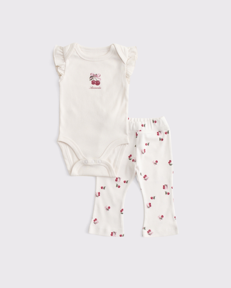 Our cute set in a soft knit fabric. This short-sleeve bodysuit features an embroidered graphic logo detail at the chest, flutter sleeves and a three-snap bottom closure. These flare leggings feature an elasticated waistband and an all-over print pattern. Imported.