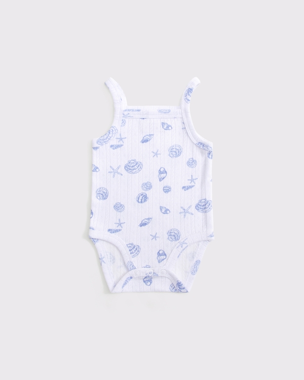 Sleeveless bodysuit in a soft pointelle fabric with three-snap bottom closure. Bloomer shorts feature elastic ruffled edges. Imported.