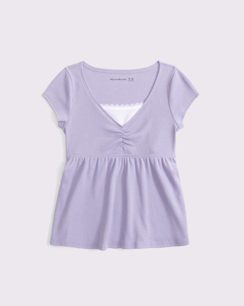 Easy-fitting short-sleeve top in our soft cotton-blend fabric and medium length, that hits right at the hips. Features a babydoll silhouette, V-neckline with lace-trim fabric detail and cinched detail at the bust. Imported.
