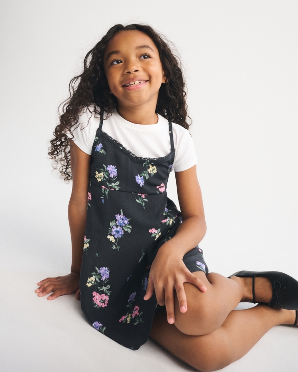 Easy-fitting short-sleeve twofer mini dress in our soft cotton-blend fabric. Features a babydoll silhouette, crew neckline and adjustable straps. Imported.
