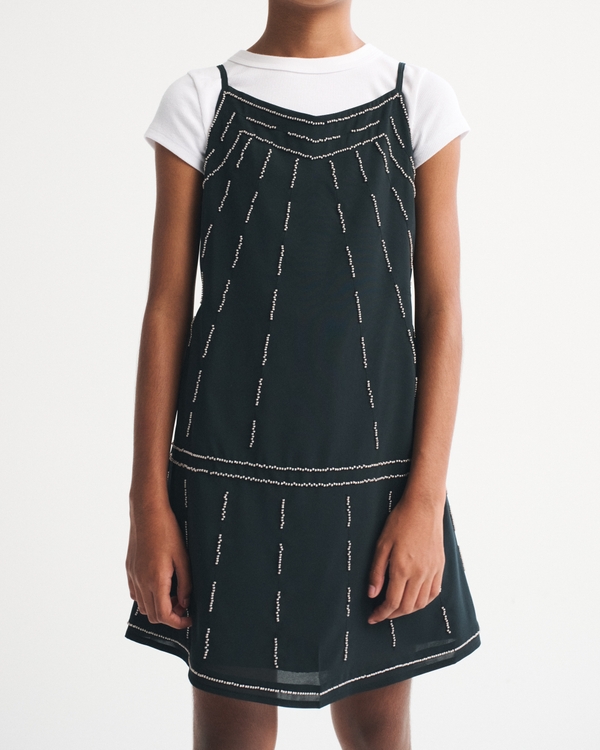 On-trend mini dress in a soft woven fabric and slim-fitting silhouette, with silver beaded details throughout, V-neckline and adjustable straps. Imported.