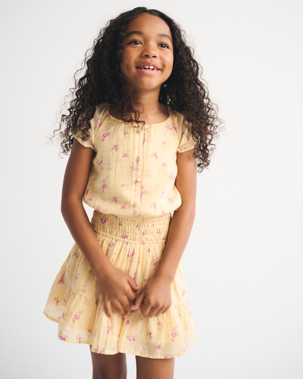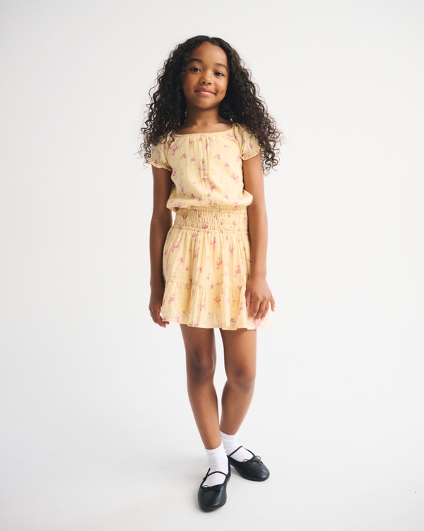 Our short-sleeve mini dress in a soft cotton fabric, with a crew neckline and smocking details at the waist. Imported.