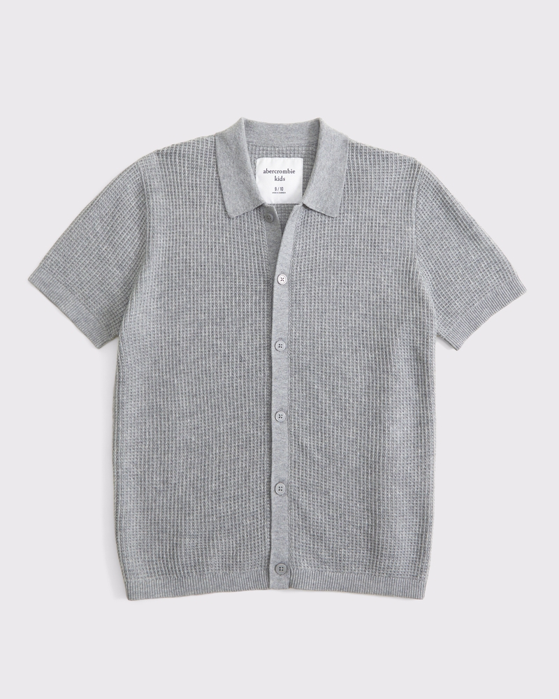 Comfortable short-sleeve sweater polo in a soft knit fabric, with button-through detail, resort-style camp collar and banded hem and cuffs. Imported.