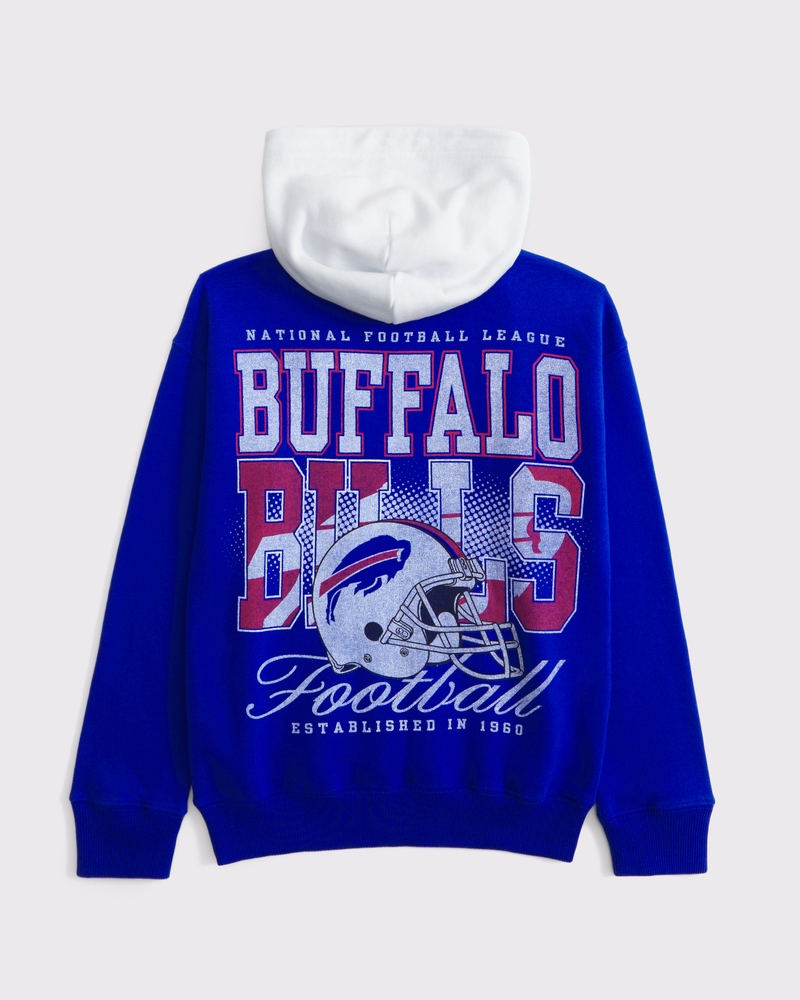 Comfy popover hoodie in our soft fleece fabric, featuring Buffalo Bills-inspired graphic details at left chest and back, front pouch pocket, ribbed hem and thumbholes at cuffs. Imported.