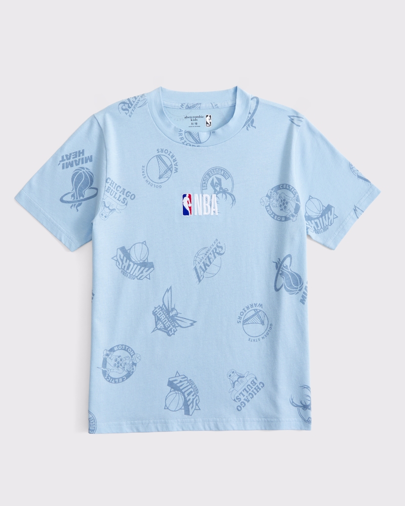 Comfortable short-sleeve tee in a soft cotton-blend fabric, with NBA embroidered logo on center chest, all-over NBA team pattern, and a crew neckline. Imported.