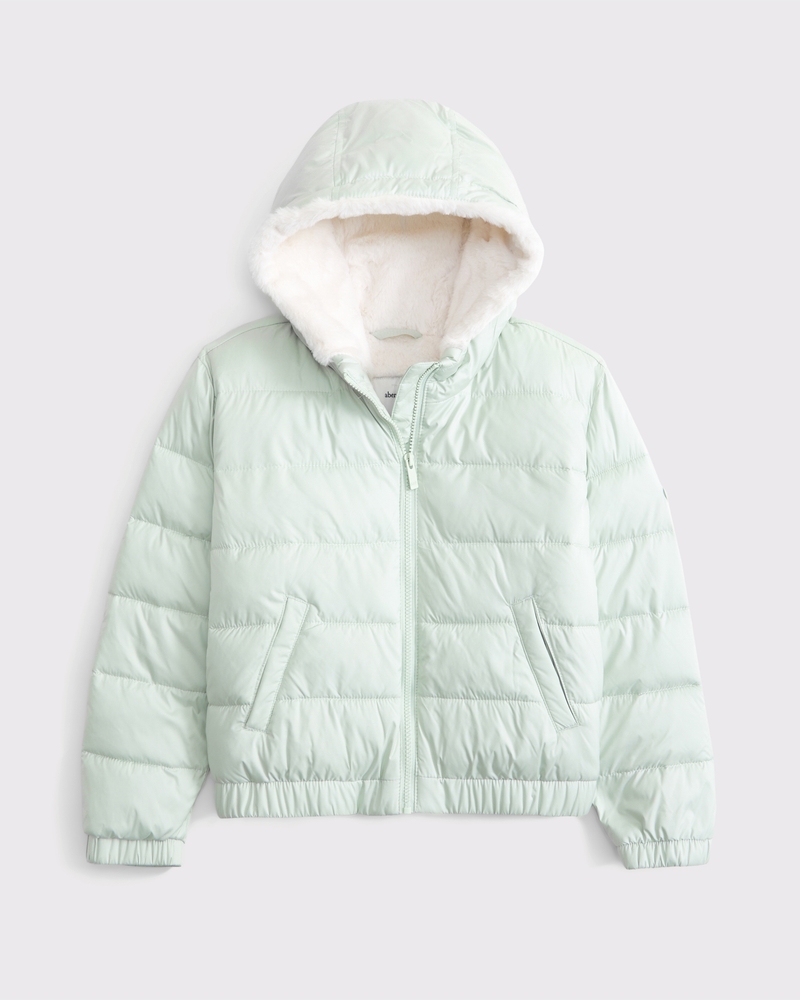 Our new puffer bomber jacket in a wind- and water-resistant fabric, featuring a cozy interior lining, on-trend quilted details, faux fur-lined hood, zip-up front, recycled fill, side pockets and cinched hem and cuffs. Imported.