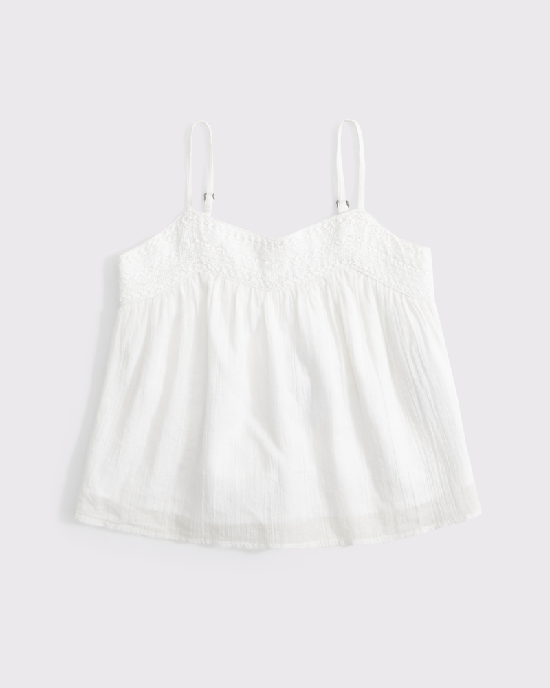 Easy-fitting cami top in our soft cotton fabric and short length, that covers the waistband and hits slightly above the hips. Features crochet-style stitching details along the V-neckline and adjustable straps. Imported.