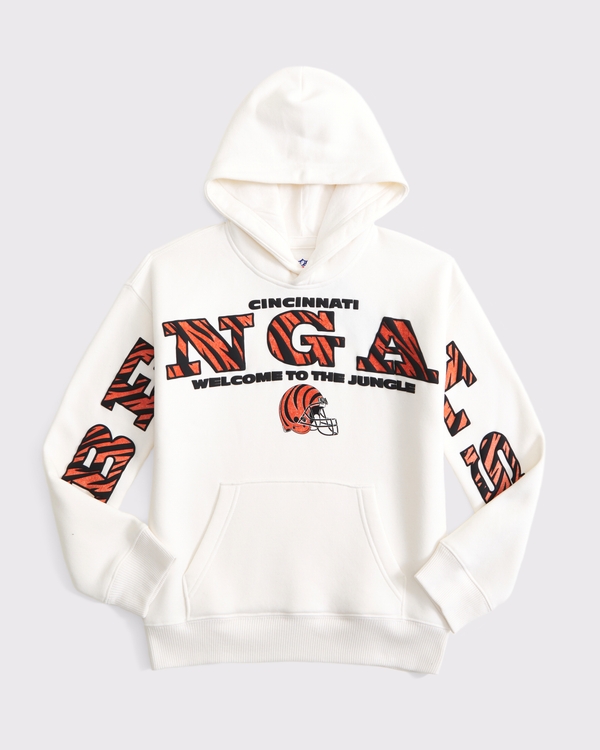 Comfy popover hoodie in our soft fleece fabric, featuring Cincinnati Bengals-inspired graphic details at chest and sleeves, front pouch pocket, ribbed hem and thumbholes at cuffs. Imported.