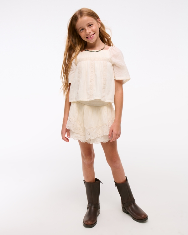 Flattering short-sleeve top in a soft gauzy fabric and loose fit, with on-trend embroidered details throughout, square neckline and curved hem. Imported.