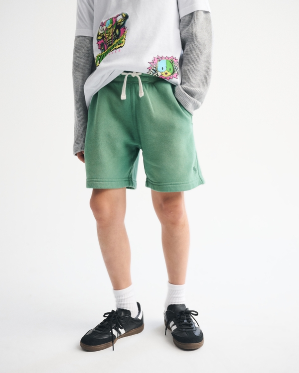 Comfy above-the-knee length shorts in a soft fleece fabric. Features an elasticated waistband with adjustable drawcords, pockets and embroidered icon detail. Imported.