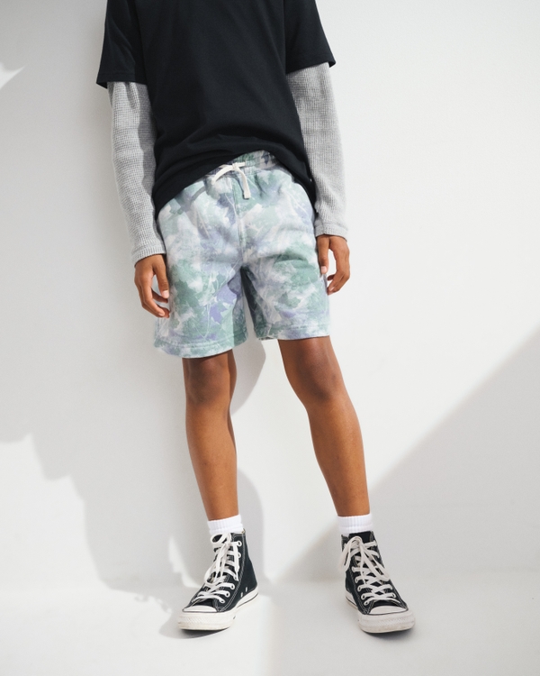 Comfy above-the-knee length shorts in a soft fleece fabric. Features an elasticated waistband with adjustable drawcords, pockets and an embroidered icon detail. Imported.