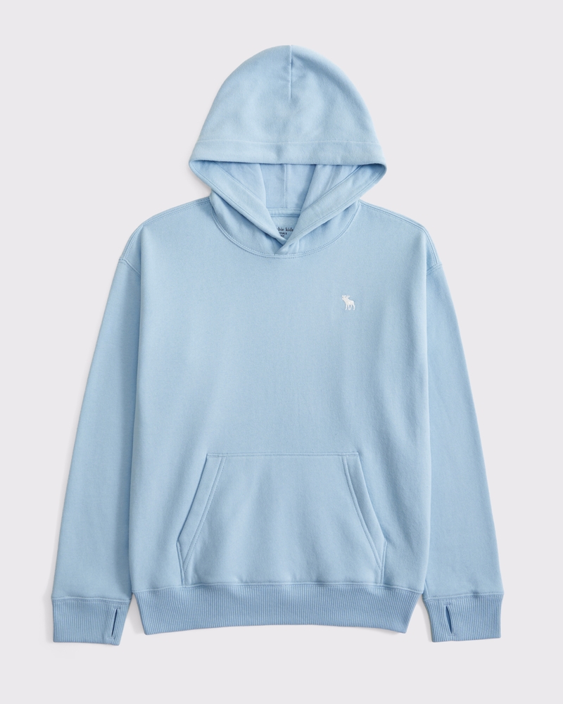 Comfy popover hoodie in a soft fleece fabric with embroidered icon at left chest, front pouch pocket, ribbed hem and thumbholes at cuffs. Imported.