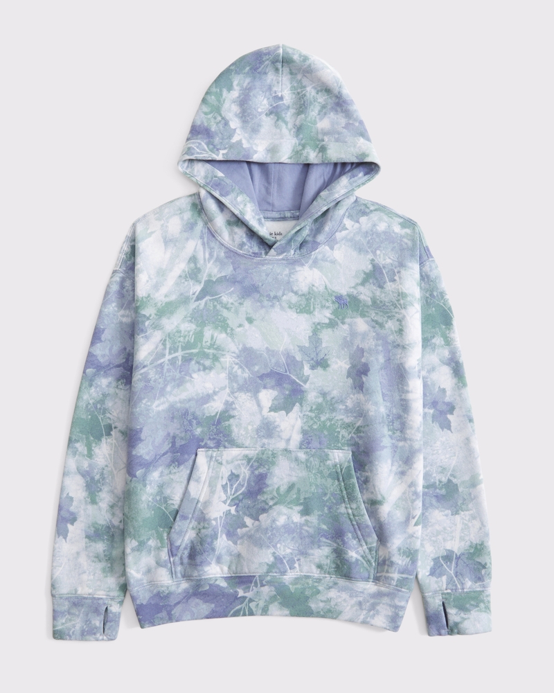 Comfy popover hoodie in a soft fleece fabric, with an all-over tie-dye wash effect, embroidered icon at left chest, front pouch pocket, ribbed hem and thumbholes at cuffs. Imported.
