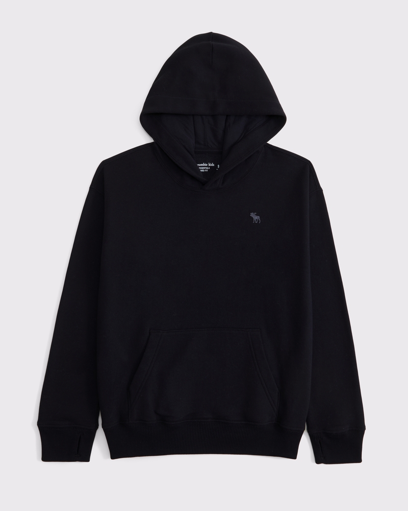 Comfy popover hoodie in a soft fleece fabric with embroidered icon at left chest, front pouch pocket, ribbed hem and thumbholes at cuffs. Imported.