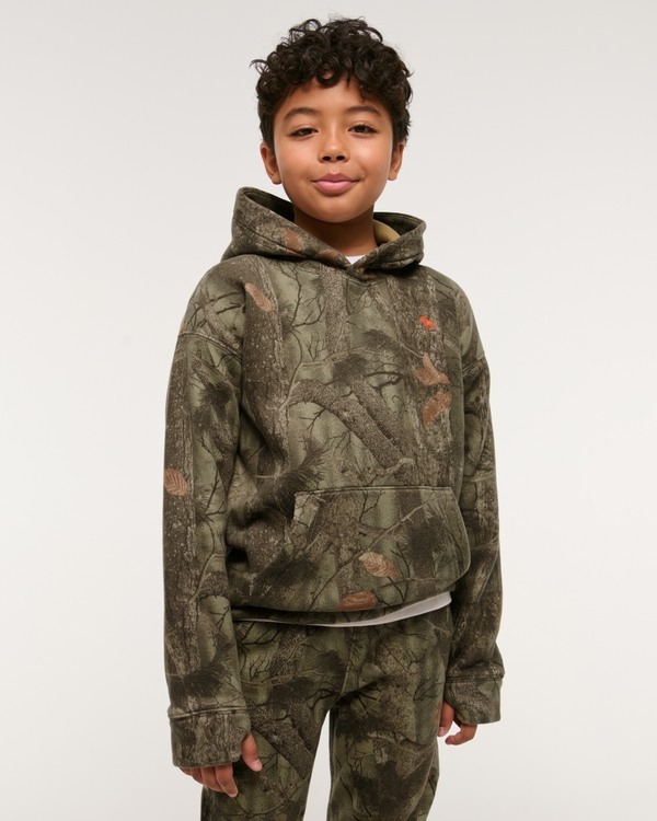Comfy popover hoodie in a soft fleece fabric with embroidered icon at left chest, front pouch pocket, ribbed hem and thumbholes at cuffs. Imported.