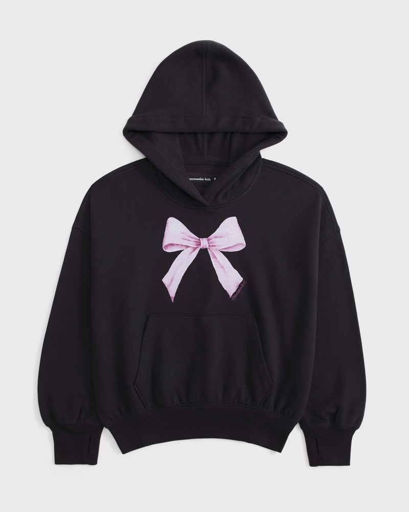 Super comfy popover hoodie in our super soft fleece fabric and longer length. Features imagery graphic detail at the chest, a front pouch pocket, a banded hem and thumbholes at cuffs. Imported.