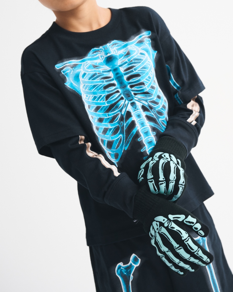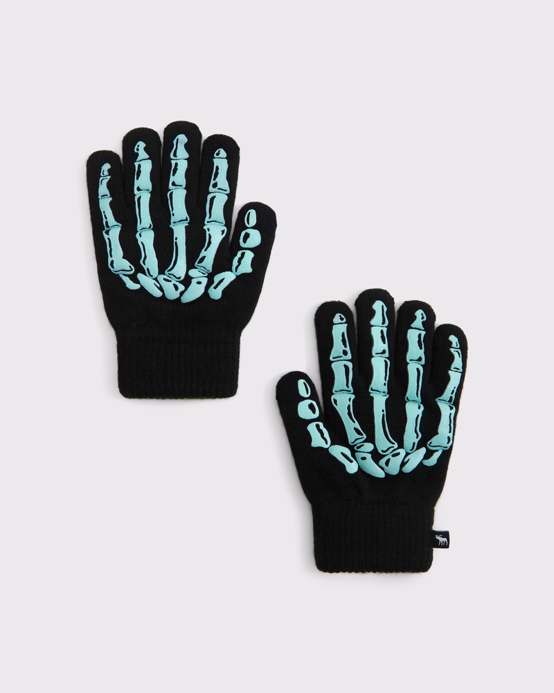 Comfy knit gloves with glow-in-the-dark skeleton graphic details and small logo tag detail. Perfect for touch screens, too! Imported.