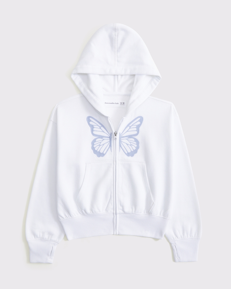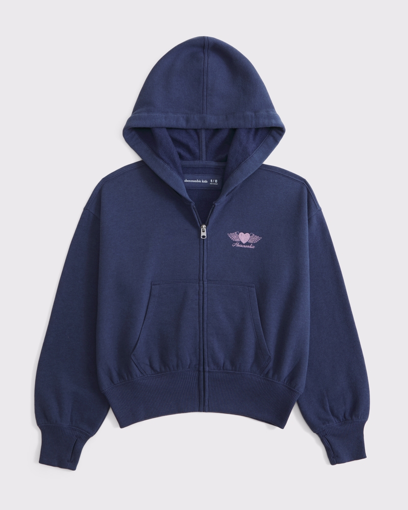 Our comfy full-zip hoodie in a soft fleece fabric, featuring graphic details at left chest and back, side pockets, banded hem and thumbholes at cuffs. Imported.