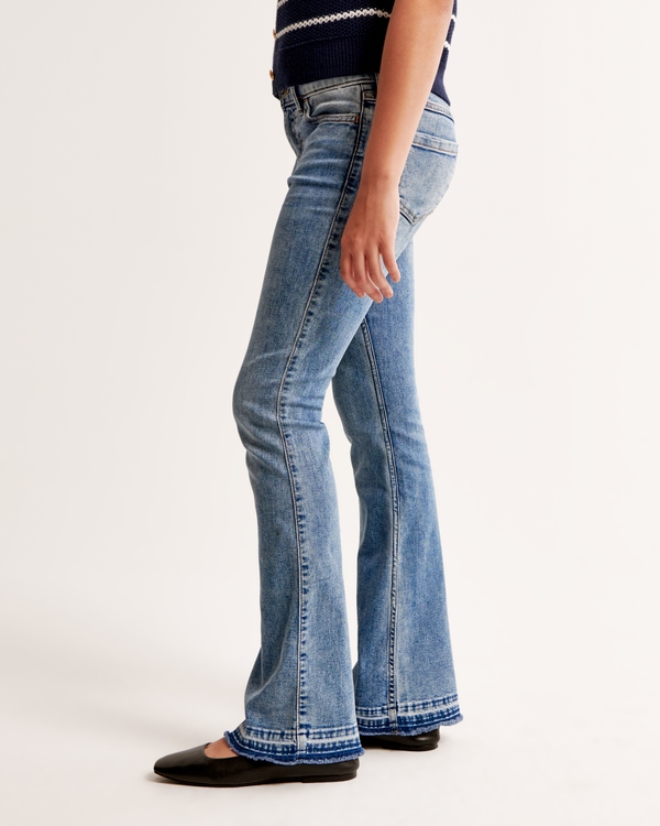 High rise flare jeans in a medium wash with functional pockets and waistband adjusters in all sizes. Imported.