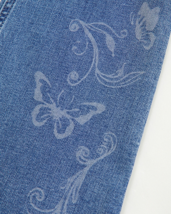 High rise flare jeans in a medium wash with printed butterfly details, functional pockets and waistband adjusters in all sizes. Imported.