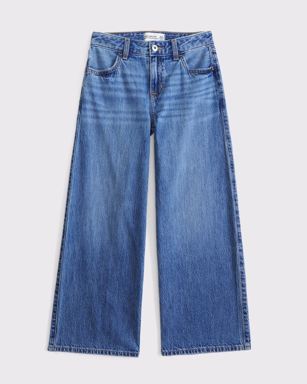 Our new high rise jeans in our comfortable lightweight denim and ultra wide-leg silhouette, with a full-length leg, medium wash, functional pockets and waistband adjusters in all sizes. Imported.