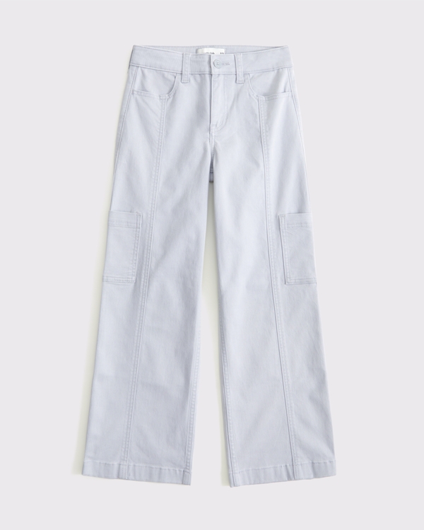 High rise wide leg pants in a stretchy twill fabric, with on-trend seaming details, zipper closure and cargo-style pockets. Imported.