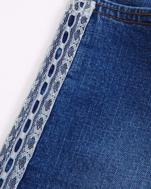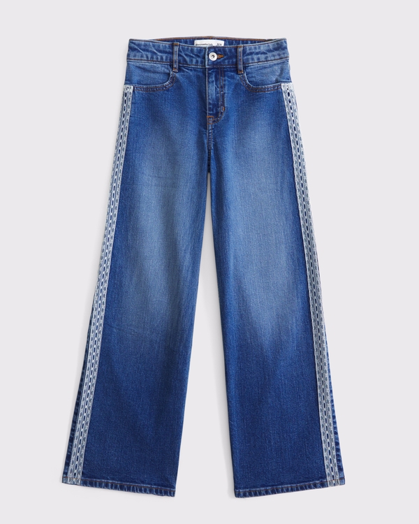 Our new high rise jeans in a wide-leg silhouette with a full-length leg, light wash, on-trend lace seaming details, functional pockets and waistband adjusters in all sizes. Imported.
