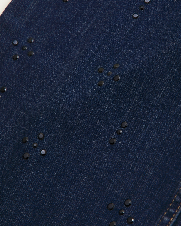 Our new high rise wide leg fit jeans, in a dark wash, with rhinestone details at the hem, functional pockets and waistband adjusters in all sizes. Imported.