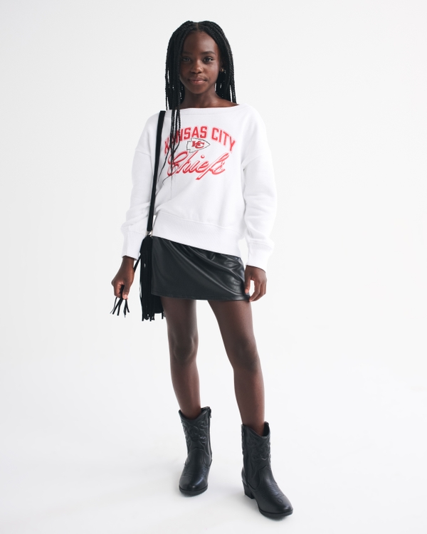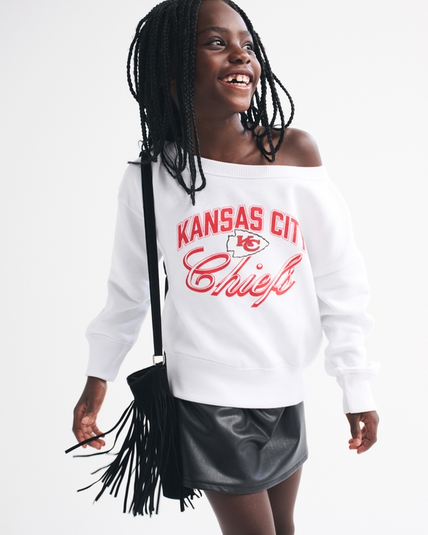 Super comfy sweatshirt in our core fleece fabric, with off-the-shoulder detail, Kansas City Chiefs-inspired graphic detail at chest, crew neckline and banded hem and cuffs. Imported.